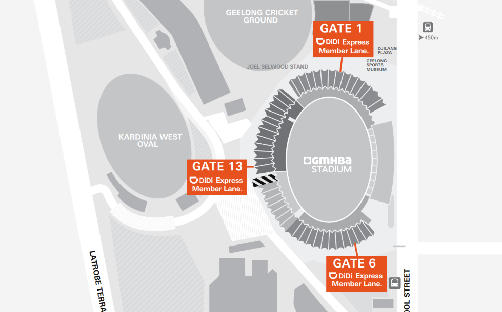 The Didi Member Express Lane is at Gate 1, Gate 13 & Gate 6 at GMHBA Stadium as seen below on the stadium map.